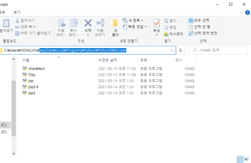 4. cmd를 열고 파일 위치를 C:\Users\사용자명\AppData\Local\Programs\Python\Python39\Scripts로 옮겨준다.