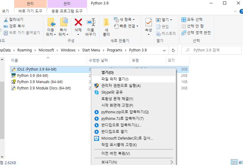 1. 찾기에서 idle을 검색하고 파일 위치 열기를 누른다.